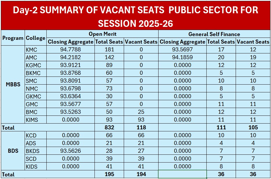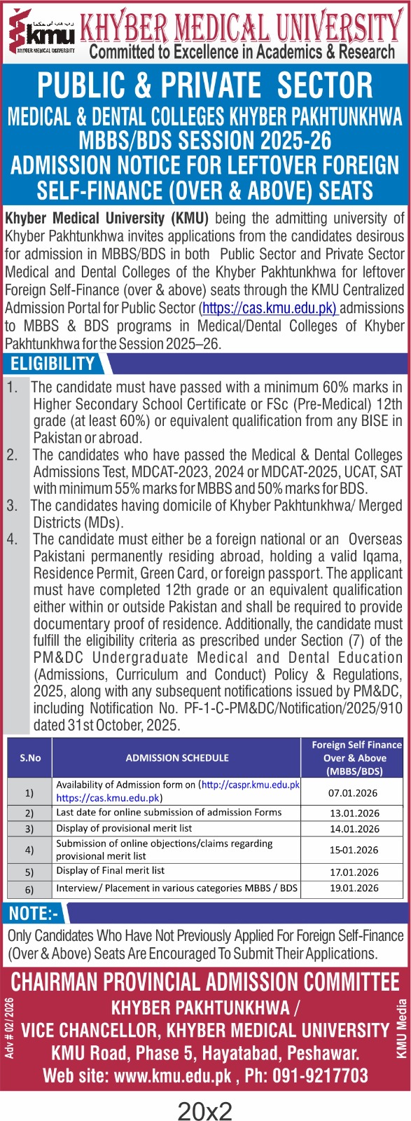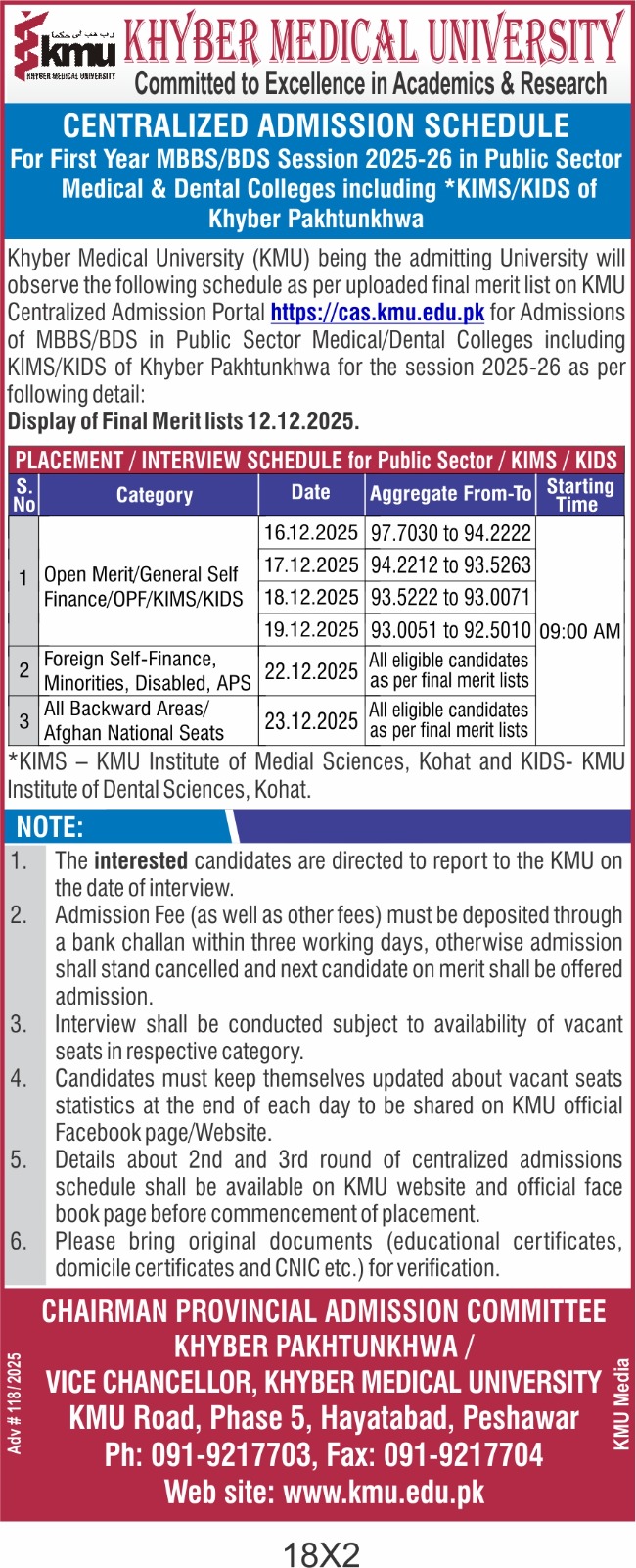 Khyber Medical University (KMU) being the admitting university of Khyber Pakhtunkhwa invites applications from the candidates desirous for admission in MBBS/BDS in the following Public Sector Medical and Dental Colleges