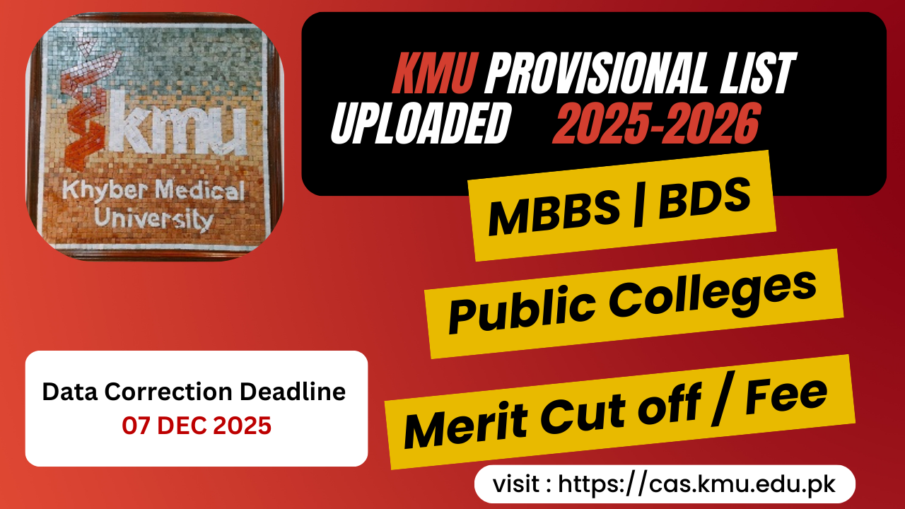 Khyber Medical University (KMU) being the admitting university of Khyber Pakhtunkhwa invites applications from the candidates desirous for admission in MBBS/BDS in the following Public Sector Medical and Dental Colleges (Click Here For ALL Colleges) of the Khyber Pakhtunkhwa and for reciprocal seats in AJK & other provinces.